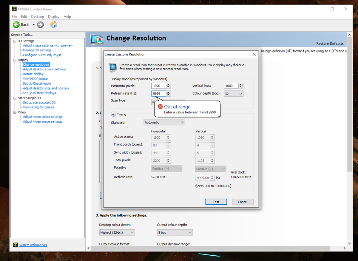 - Add in the width, height, and refresh rate value you would like for this custom profile. Increment the refresh rate no more than 5 Hz from the rate already in effect to carry this procedure out safely.