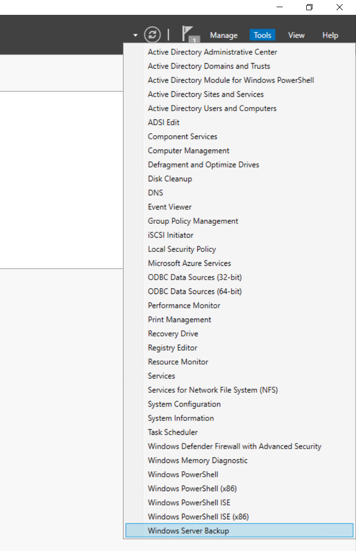 - Click on Tools at the top right side of the window and then click Windows Server Backup