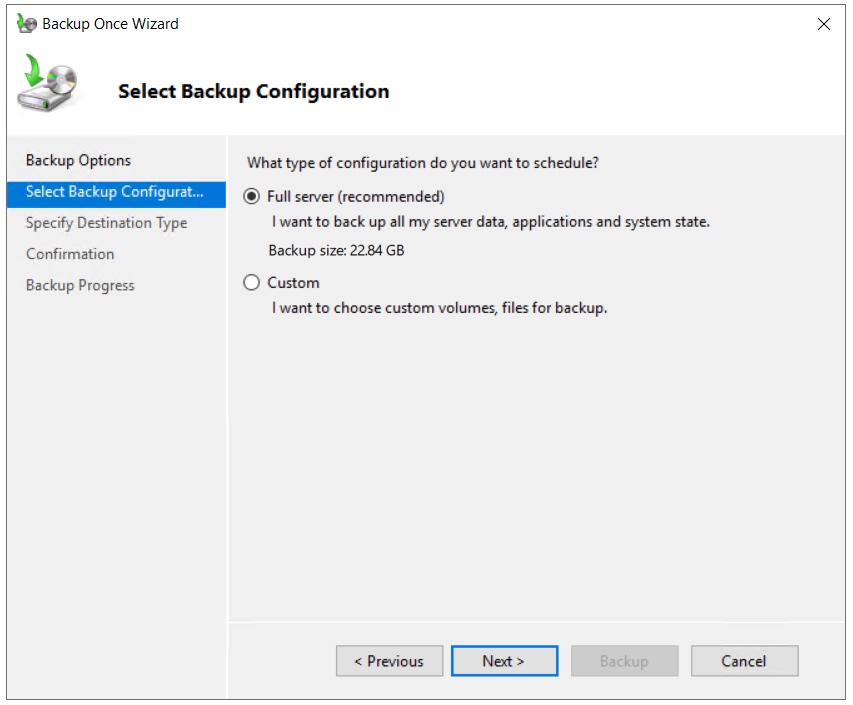 - Under Select Backup Configuration, select Full server (recommended) to backup server data, application and system state and then click Next