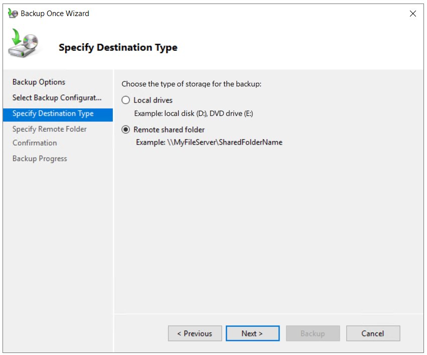- Under Specify Destination Type select Remote shared folder and click You can not back up data to local storage if backup storage is not available. Exclude a volume from the list of volumes or back up or add another disk and then retry the operation.