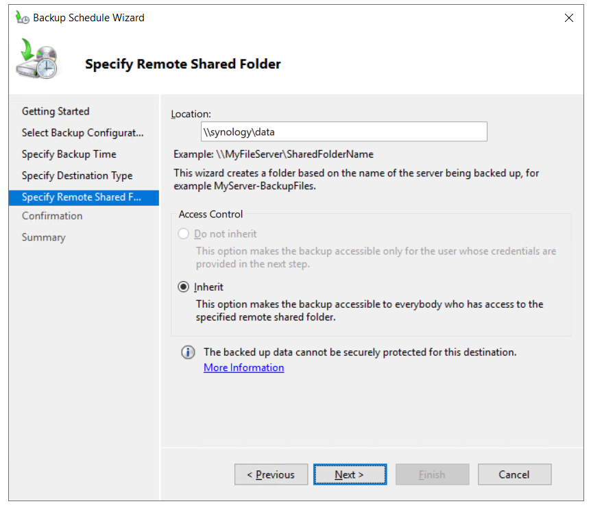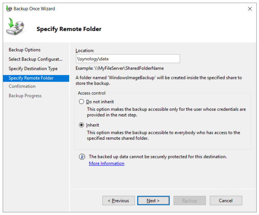 - Specify a remote location, click on Inherit, and click The inherit option makes the backup accessible to everybody who has access to the specified remote shared folder.
