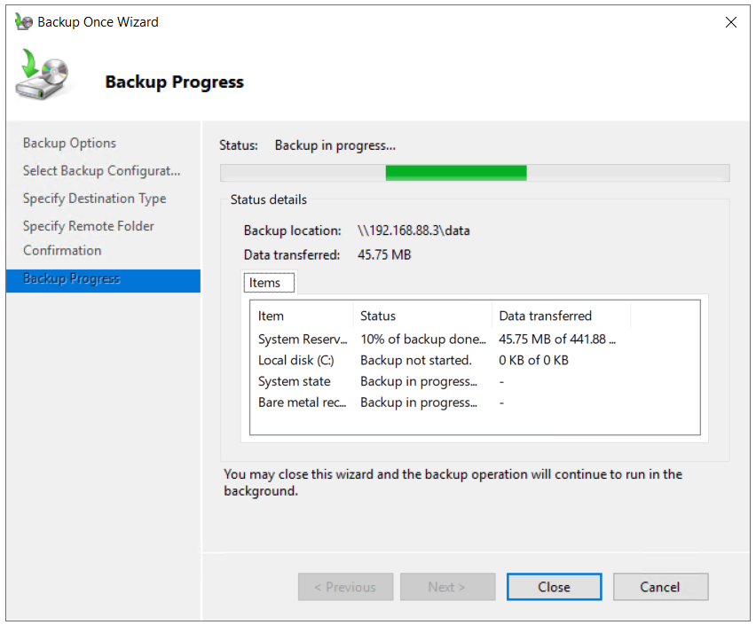 - Check the Backup Progress. You may close this wizard and the backup operation will continue to run in the background. You can also check it directly in the Backup tool.