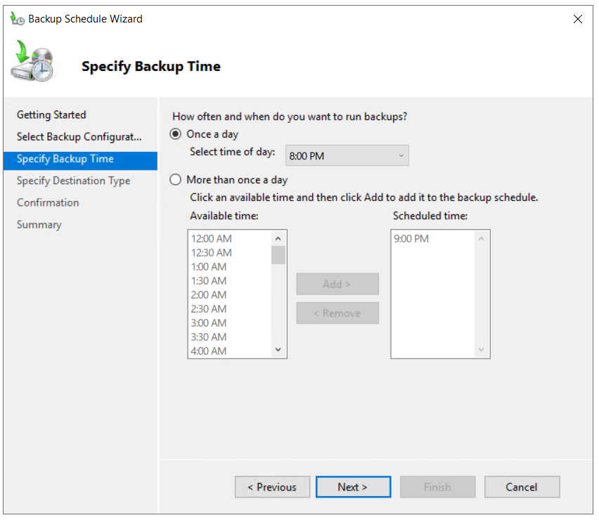 - Under Specify Backup Time configure the schedule when you want to perform full server backup and click Next. There are two options to configure, backup once a day and for more backups once a day. In our case, we will do a scheduled backup once a day at 8:00 PM.