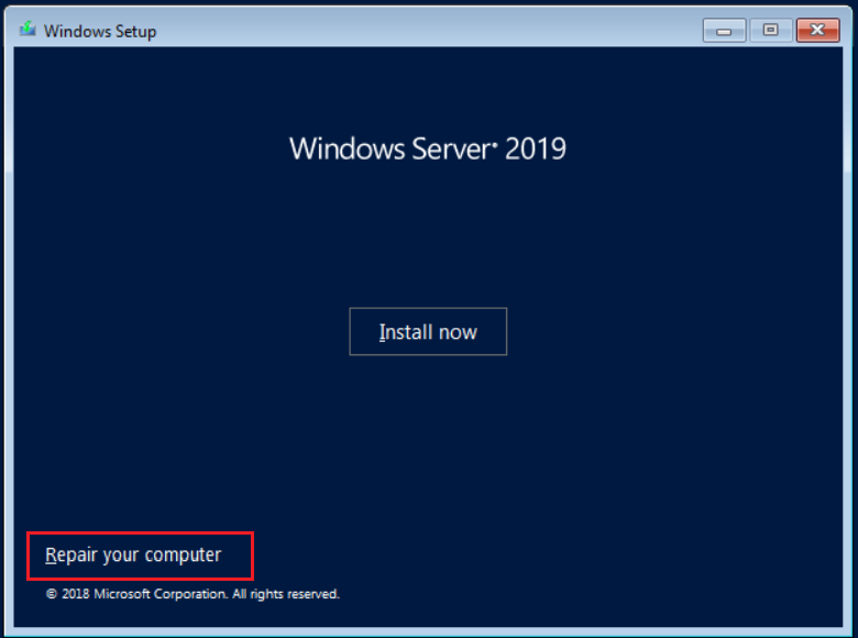 - Insert or attach a bootable DVD or USB to the machine. The bootable drive must include the Windows image you are running on your machine. In our case, it is Windows Server 2019.
