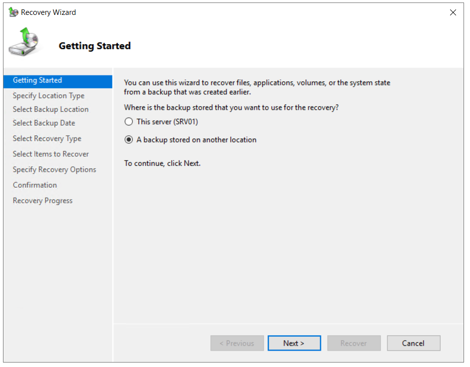 The way you should do a recovery depends on the scenario. In case you can access Windows and open Windows Server Backup, you can do it by running the Recover option as described below.