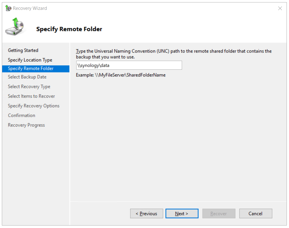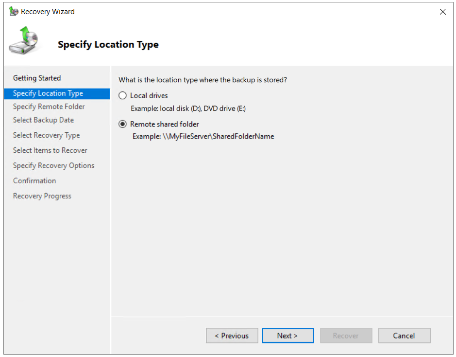 - Under Getting Started, choose the location where you have stored your backup and click Next. In our case, it is stored on a network share.