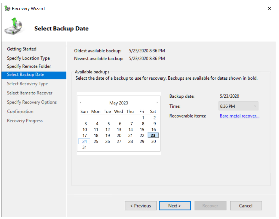 - Select the date of a backup to use for recovery. Backups are available for dates shown in bold.