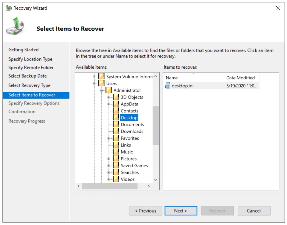 - Select Items to recover and click Next. As an example, we will recover all files from the Desktop.