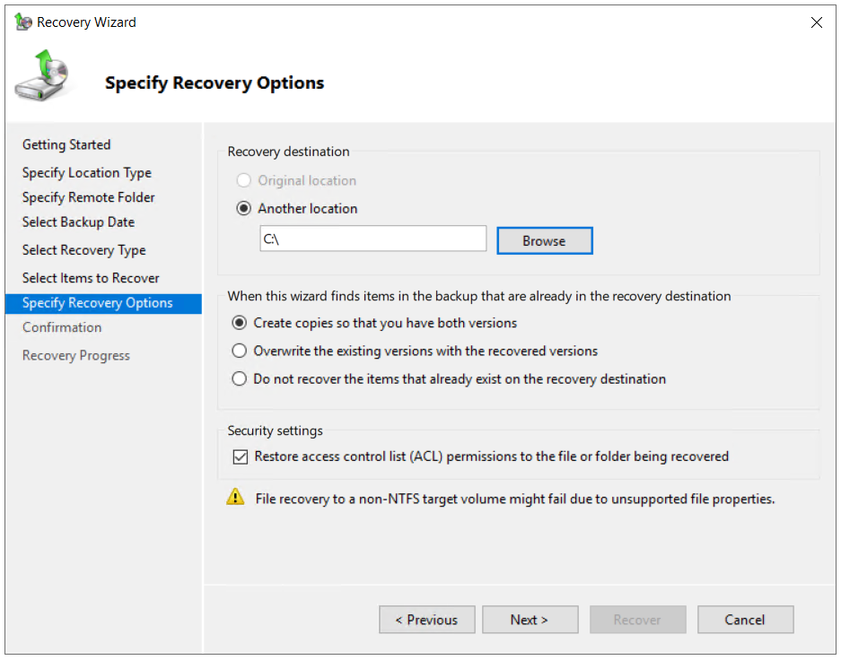 - Specify Recovery Options and choose what do you want to do with copies and click Next.