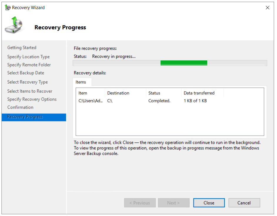 - Check the Recovery progress. Once it is finished click Close.