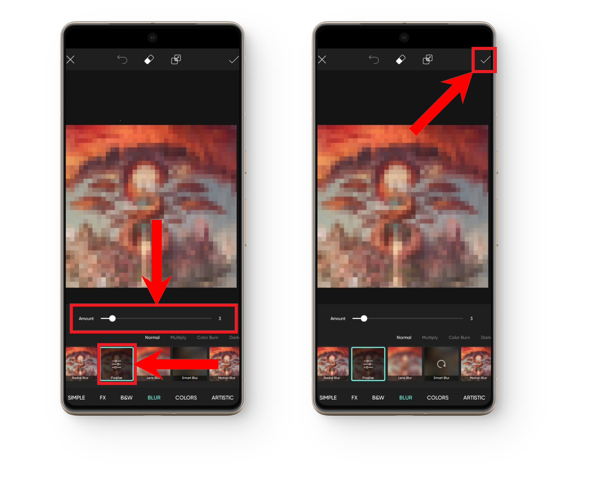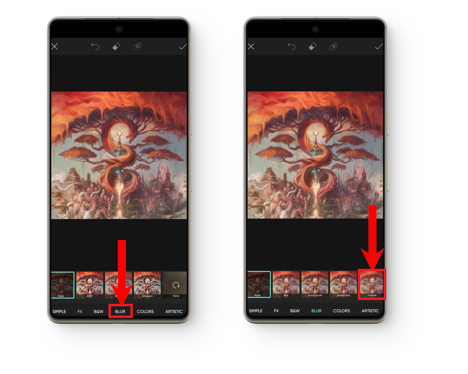 From the various effects offered, tap on the Blur section and select the Pixelate option.