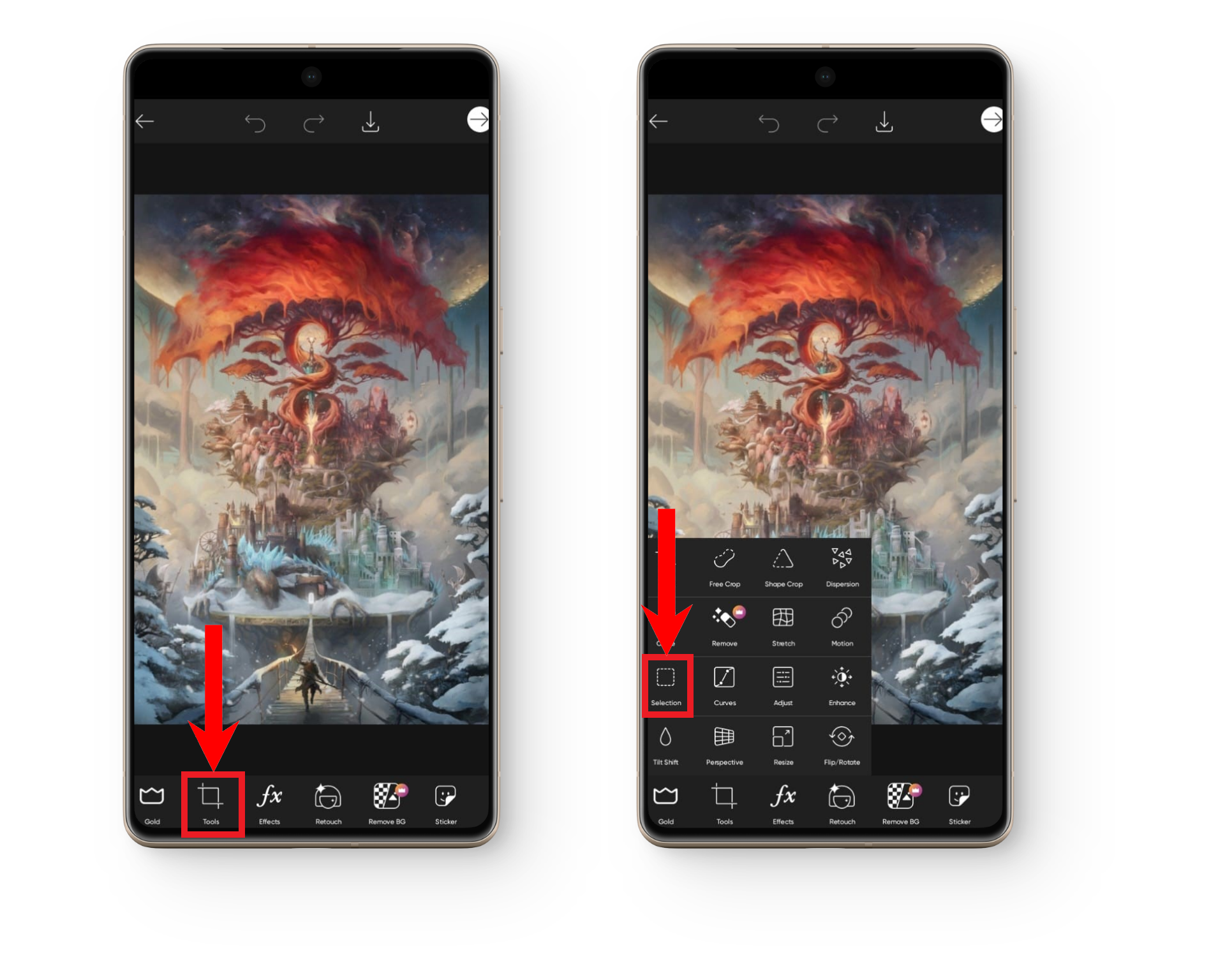 Once you’ve selected the image, you’ll be directed to the editing page. Tap on Tools. From the options present, choose Selection.