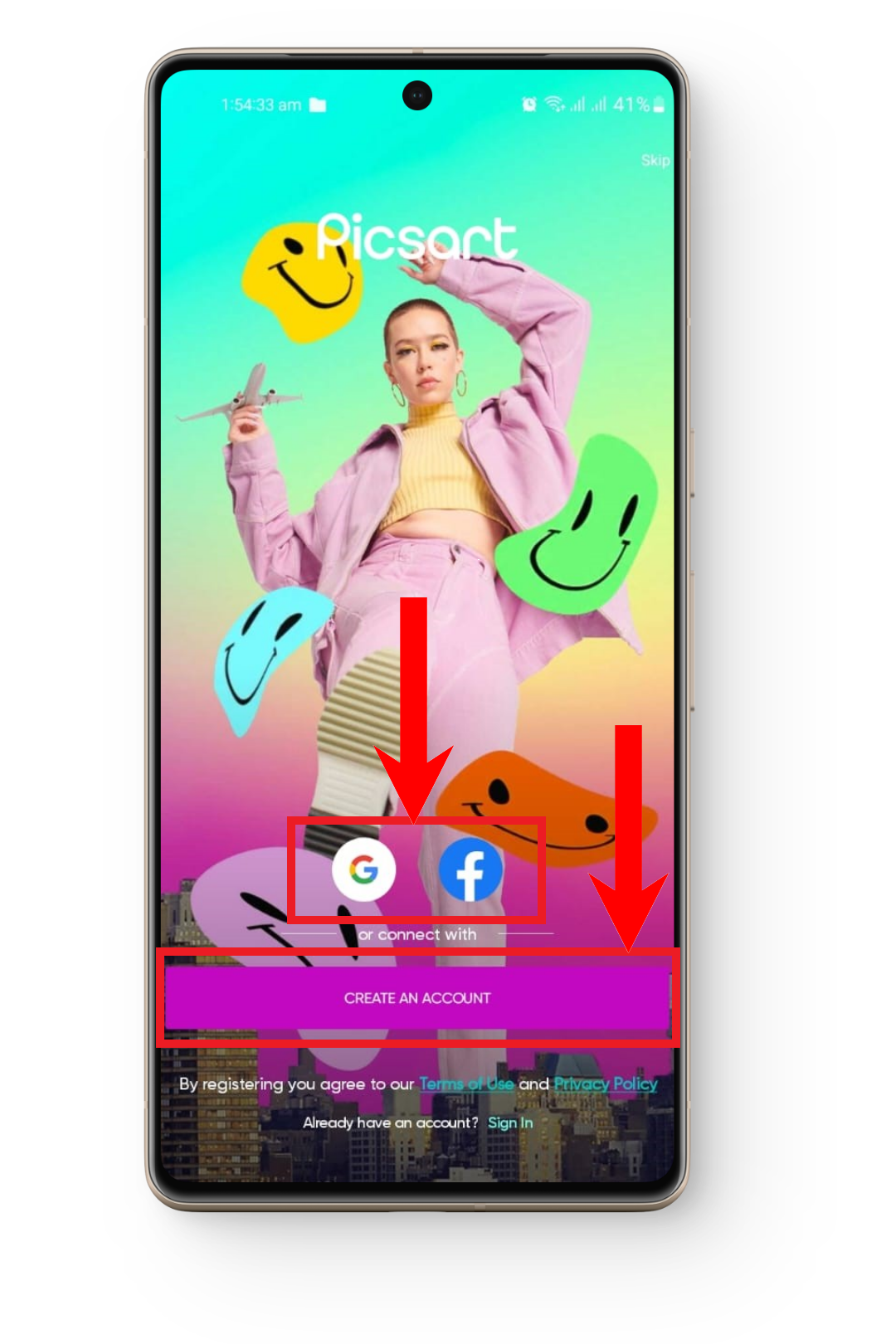 First off, open the Picsart app. Create a Picsart account or use your Google or Facebook account to sign-in.