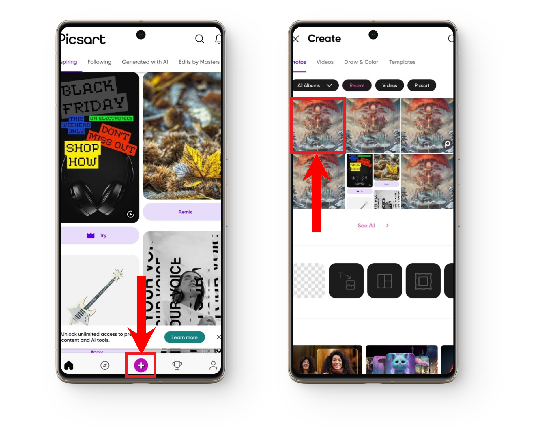 On the homepage, tap on the Plus icon in the bottom center of the screen and browse around the image to be pixelated.