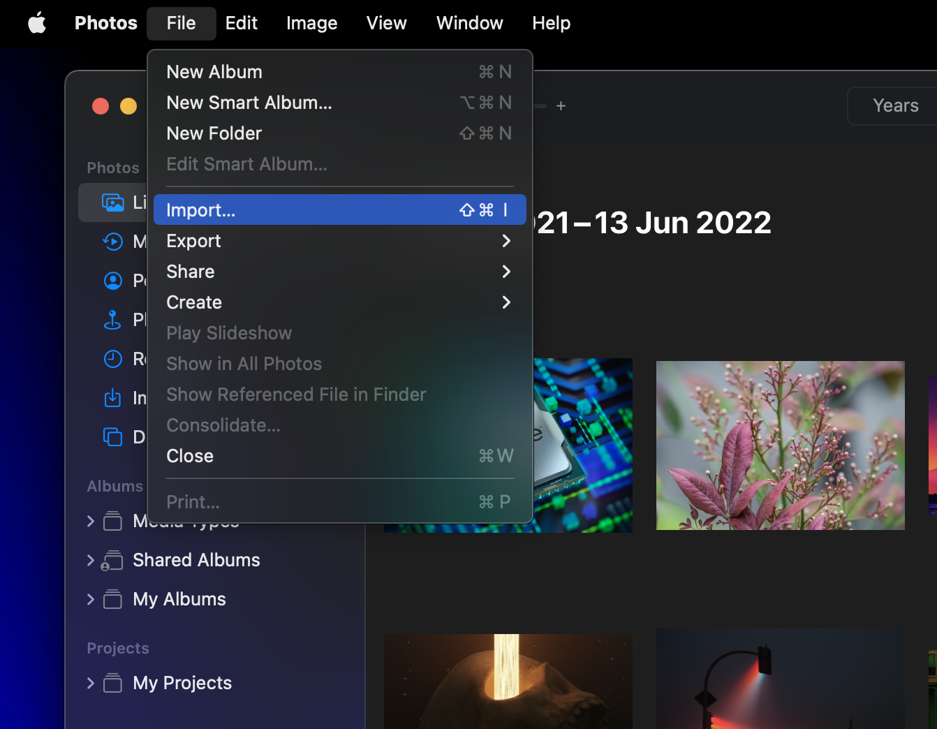 Open up the Photos app on your Mac - Click on File. From the drop-down, click on Import.