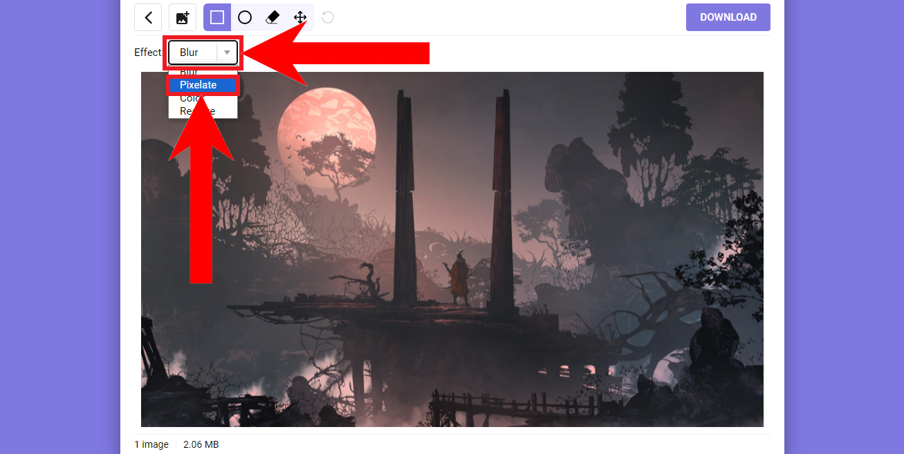 Once the picture is uploaded, click on the Effect drop-down and select Pixelate.