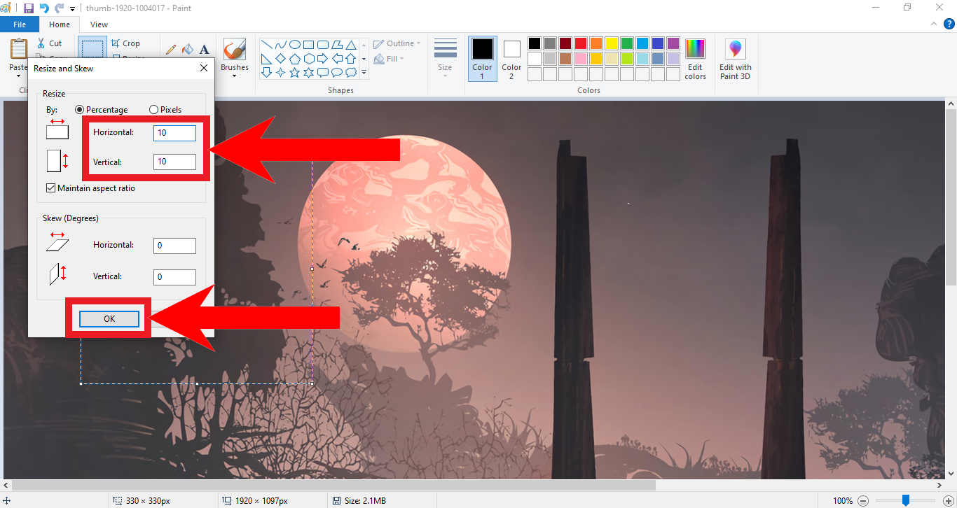 Enter your desired values and click on “OK” - The area you selected earlier will now have shrunk down (the lower the value, the smaller the area becomes), leaving a large white space that shows the area it occupied. Drag one of the corners to return the portion to its original size.