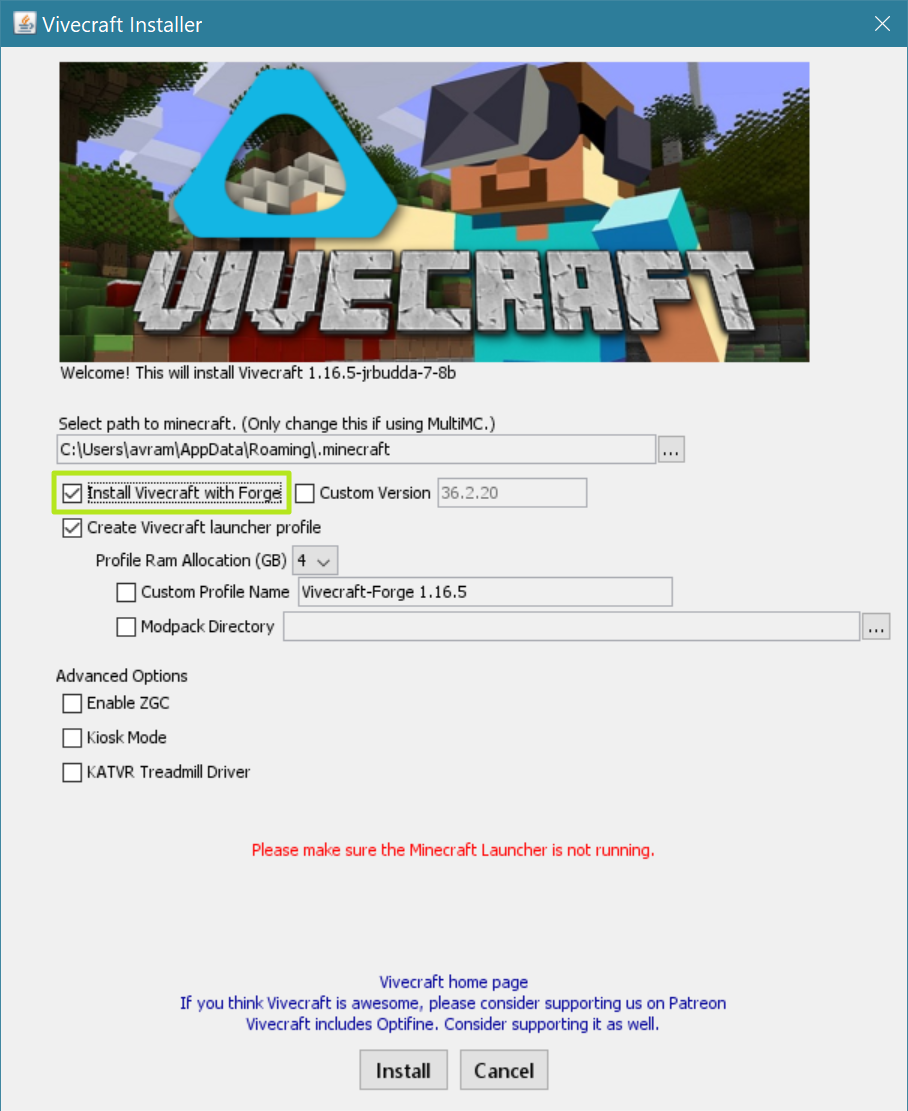 - During installation, tick the box labeled ‘Install Vivecraft with Forge‘ to enable Forge mod compatibility.