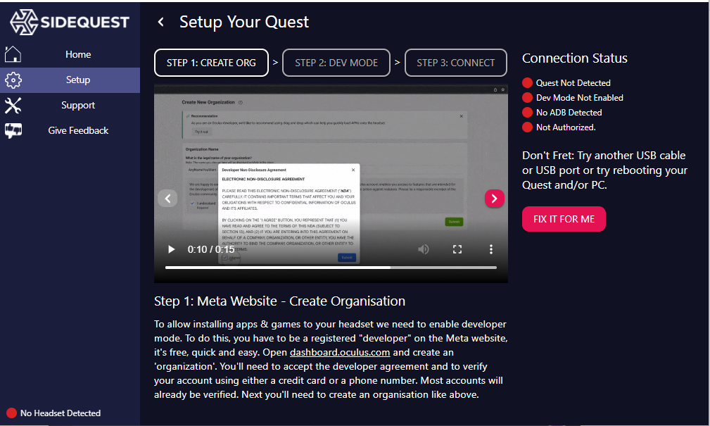Organization Creation Instructions on SideQuest[/caption> - Connect your Oculus headset to your PC via a USB cable, then launch SideQuest. The application should automatically detect your headset. The first time you connect, you will need to approve a permissions prompt to continue.