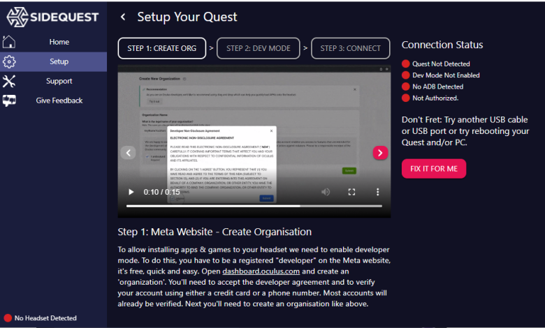 Organization Creation Instructions on SideQuest[/caption> - Download the Oculus Mobile App and enable Developer Mode from the Device Menu in the app. This is necessary to allow the installation of third-party software on your headset.