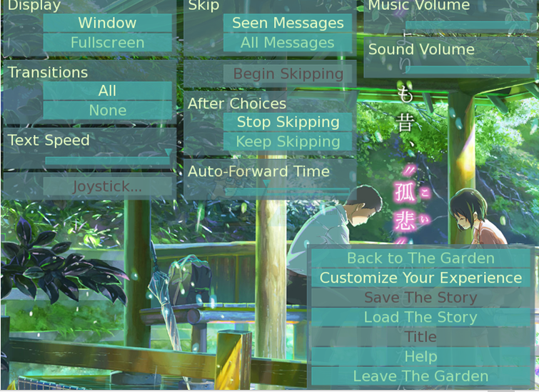 You can simply switch between the window and full screen settings as desired. You can also configure a Joystick or gamepad if you have one here. Once you’re happy with your settings, select the first back option and then select the first option. While not all games have sound and music, you should see vibrant Japanese anime-inspired images if the video is working correctly.