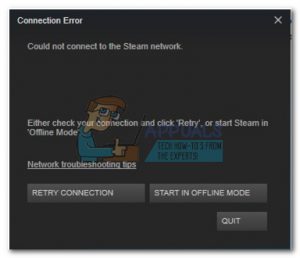 After Steam realizes you don’t have an Internet connection, you will be prompted with a message saying that you can’t access and you will have a choice between attempting to reconnect, exiting Steam and running Steam in offline mode.
