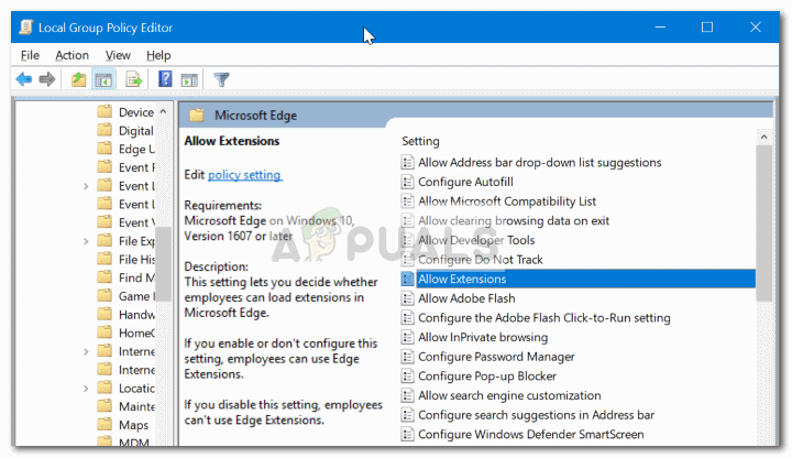 - In the Local Group Policy Editor, use the left-hand side pane to navigate to the following location Computer Configuration > Administrative Templates > Windows Components > Microsoft Edge. Once you get there, double-click on the Allow Extensions entry to bring up the Properties screen.