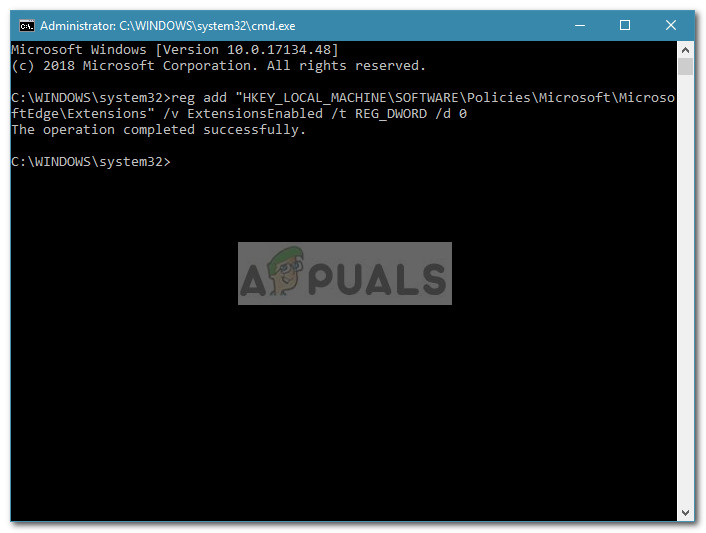 That’s it. If you get the “operation completed successfully” message, the extensions on Microsoft Edge should now be disabled. You can test this by opening the Edge browser and see whether you’re still able to to use the access the Extension menu under Settings. If you aren’t, it means that this method has been successful.