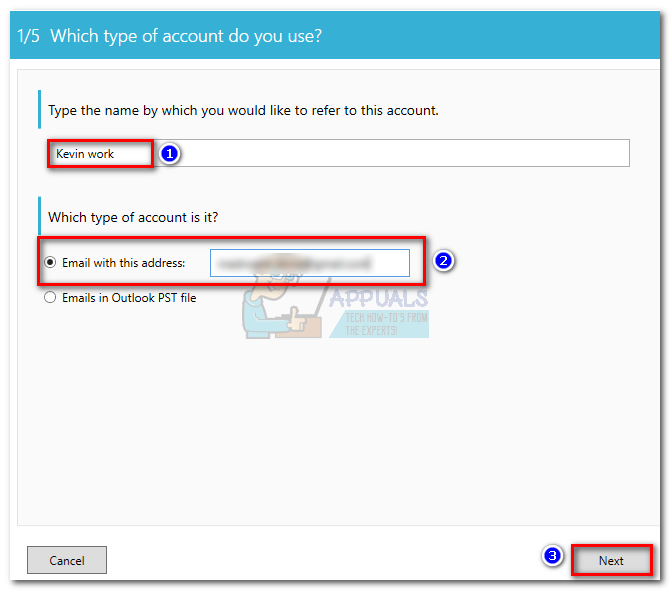 - Start the application and insert a name that will be used for your account reference. Then, select Email with this address and insert your email from where you want to print the emails. Finally, hit Next to proceed.