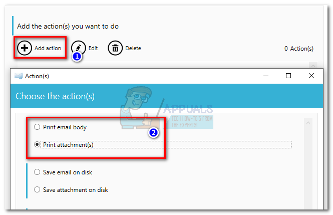 - Next, click on Add action. Select Print attachments or Print email body, depending on what you need. Hit Next and select the printer that you want to use.