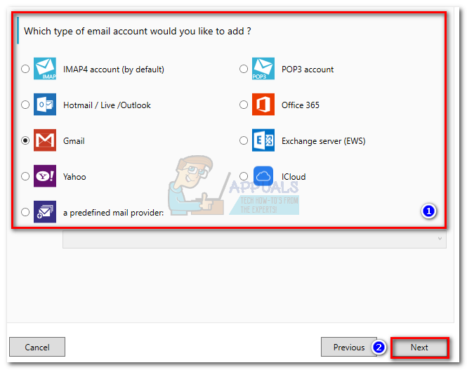 - Select your email type from the list. If your email provider is not in the predefined list, select the predefined mail provider option and look for your email configuration. Hit Next to proceed further.