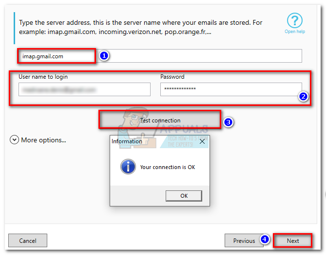 - In the next window, start by checking if the server address of your email is correct. If it is, insert your email and password in the boxes below. Then, click on Test connection to make sure your configuration is working. Finally, hit Next.