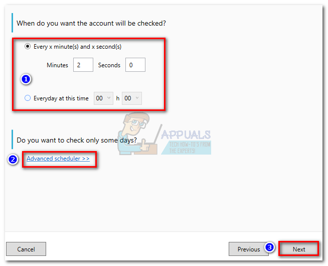 - Set the checking interval of your account according to your needs. You can also configure it to only check during your working days by clicking on the Advanced Scheduler. Hit Next to advance.