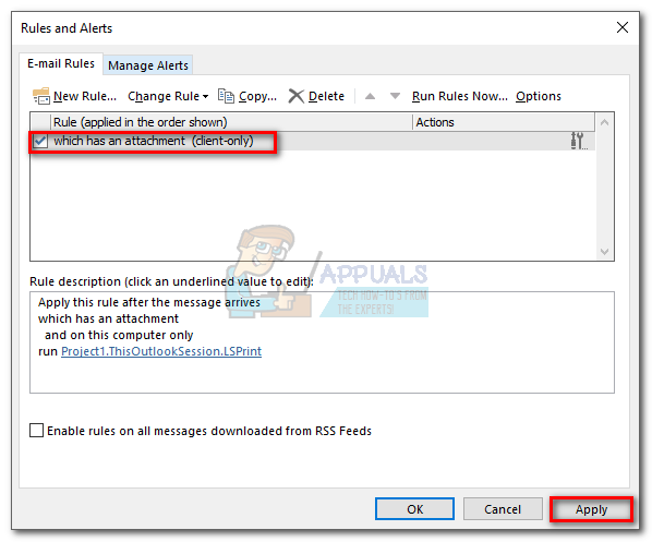 - In the Rules and Alerts window, make sure the box next to the rule you’ve just created is checked. When it is, hit Apply.