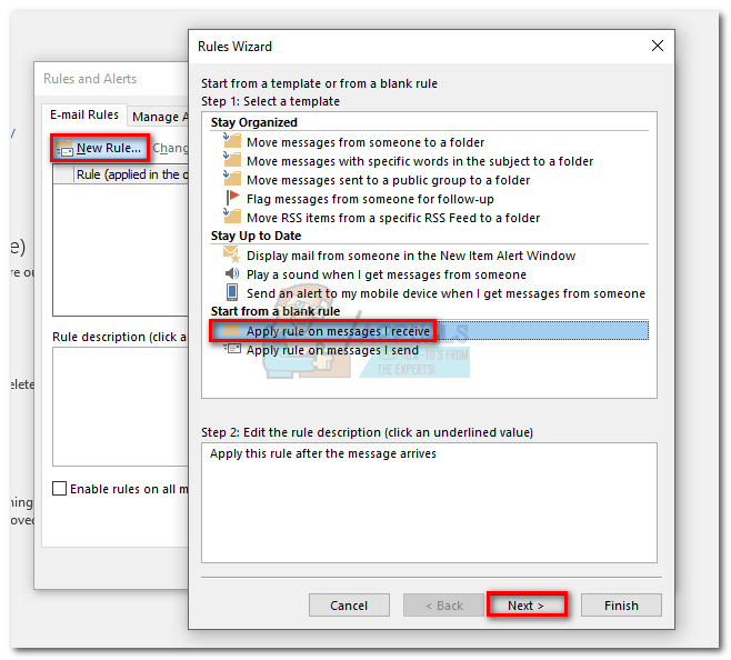- Click on New Rule, then click on Apply rule on messages I receive. Click Next to proceed.