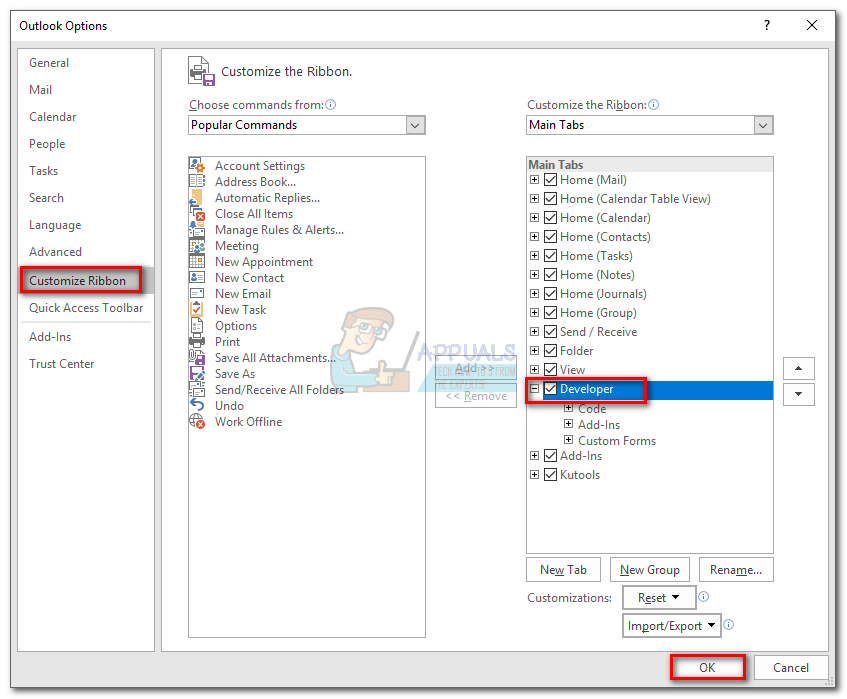 Note: If you don’t see the Developer tab, go to File and click Options. From there, click the Customize Ribbon tab and check the box next to Developer. Hit Ok to confirm. Now, the Developer tab should be visible in the ribbon at the top of the screen.