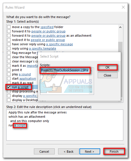 Note: If you don’t want to print all your attachments, you can use a different condition here. The script should also work with specific senders or specific words. - In the next window, check the box near run a script. Then, click on a script, highlight ThisOutlookSession and hit Ok. Next, hit Finish to confirm.
