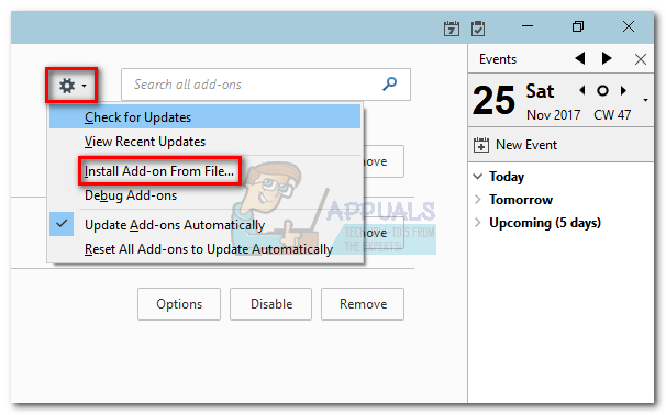 - Tap on the gear icon and click Install add-on from file.