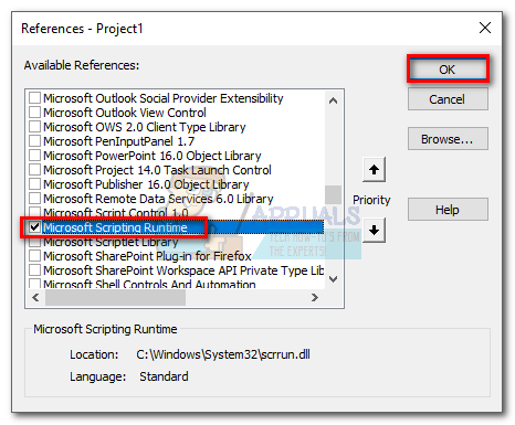 - Scroll down and check the box next to Microsoft Scripting Runtime. Click OK to save your option and close the References window.