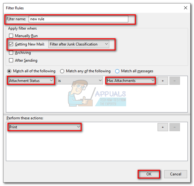 - Click the New button to create a new filter. Start by inserting a name for your filter. Then, check the box next to Getting New Mail and filter it after Junk Classification. After that, set the condition to Attachment Status > Is > Has Attachments. Finally, set the final action to Print, then hit Ok to save.