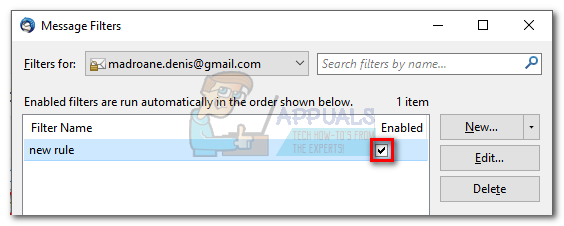- Now return to the Message Filters window and make sure the filter is enabled.