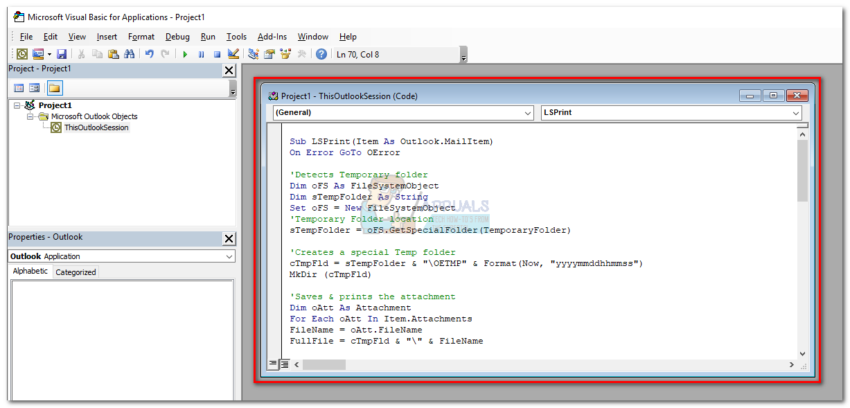 - Now paste the following script code into the Project1 window (on the right):Sub LSPrint(Item As Outlook.MailItem)