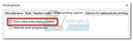 - Select the Global printing options and check the box next to Print without the dialog window. Hit Ok to save your selection.