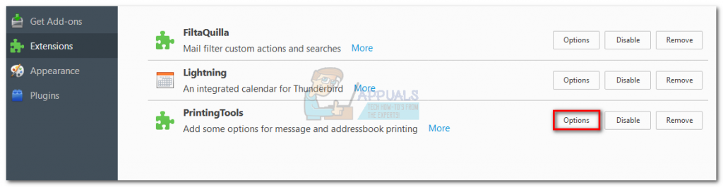 - Once Thunderbird opens again, go to Add-ons > Extensions and click the Options button of PrintingTools.