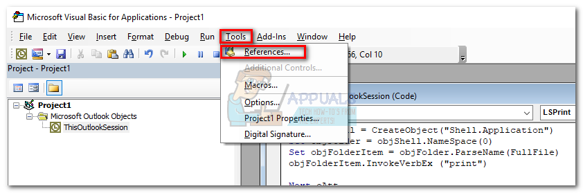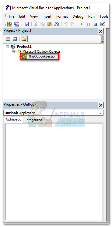 - Once the Microsoft Visual Basic for Applications window is active, expand the Project1 tree (on the left). Then, double-click on ThisOutlookSession.