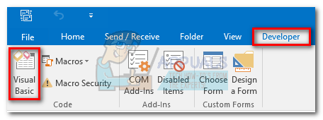 - Open Outlook and access the Developer tab from your toolbar, then click the Visual Basic button.
