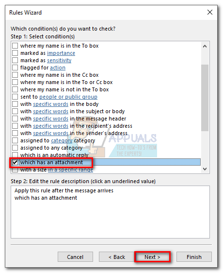 - Now you need to decide on the condition that needs to be met. If you want all your attachments to be printed, check the box next to “which has an attachment”. Hit Next to proceed.