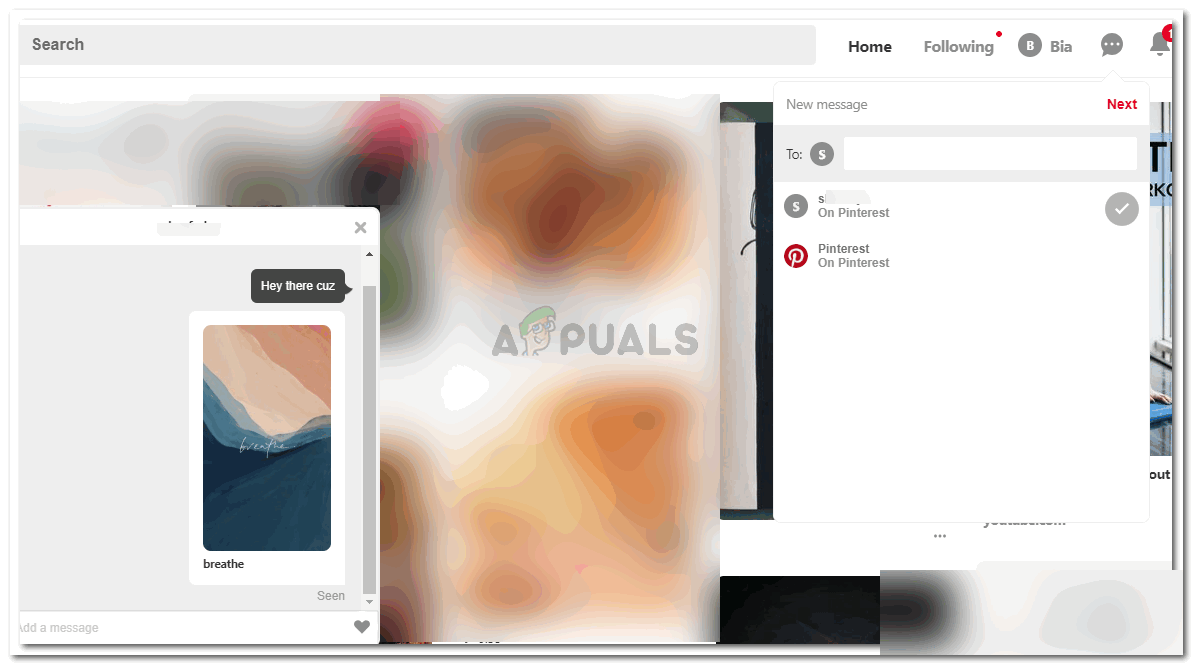 The rest for entering the name of a recipient and adding a message is the same for the website just like the application. The chat box for a certain conversation opens up separately on the left side of the page, while the Pins page in the background. This chat box looks the same as the one when you message someone from the app. The heart, the ellipses for additional chat settings and the conversation between the two visible on the screen.