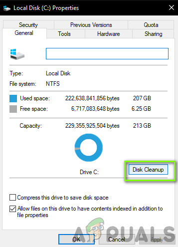 C Partition Properties - Under General click on Disk Cleanup and wait until Disk Cleanup calculates how much disk space is consumed on your Windows machine. This may take a few minutes to complete.