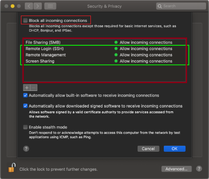 Go to System Preferences, navigate to Security and Privacy and then click on the Firewall option. Next, click on the lock icon on the preference pane so that you can access the firewall settings. Once you are in, click on Firewall options and ensure that Screen sharing, Remote management, and Remote login are on the list of allowed services.